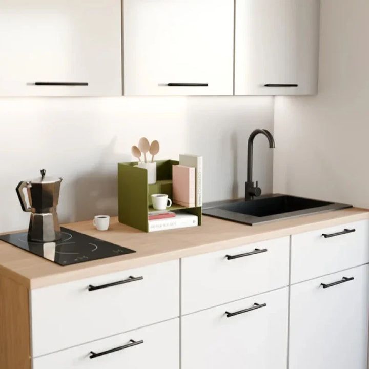 ACCOUNTANT creates space and order in your bookshelf, in the kitchen, in the office... The step shape allows you to fully utilize the depth of your shelf without losing track of your favorite books. For example, up to 3 standard paperbacks fit one behind the other in a deep BILLY